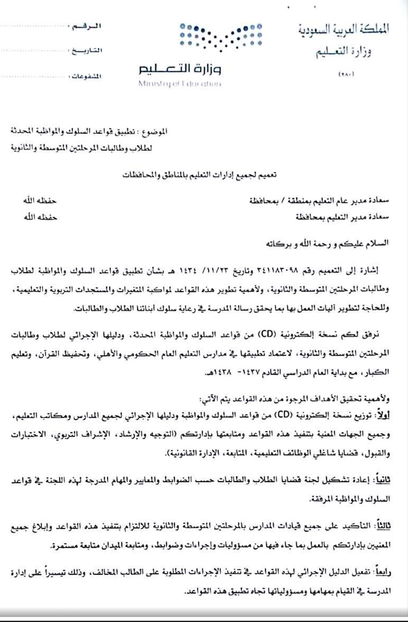 محمد بن عبيد الهاجري No Twitter تعميم من وزارة التعليم بشان تطبيق قواعد السلوك والمواظبة 1437 1438هـ Https T Co Zqvis06ar9